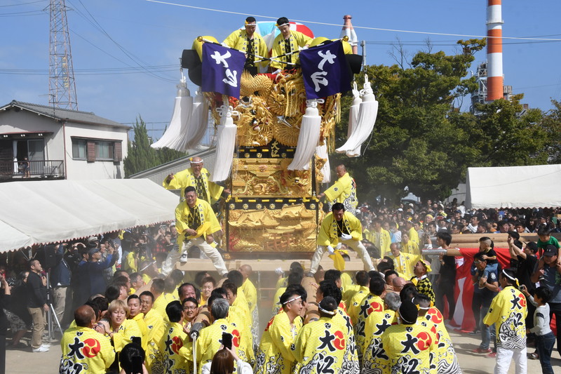 先代・大江太鼓台の飾り幕(高木縫師制作)を横山縫師を中心に金糸替え。 高欄幕の[カンケツ童子]のみ先々々代・大江太鼓台のカンケツ童子を参考に制作。 |