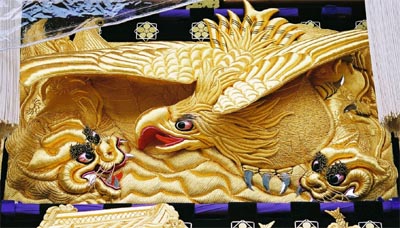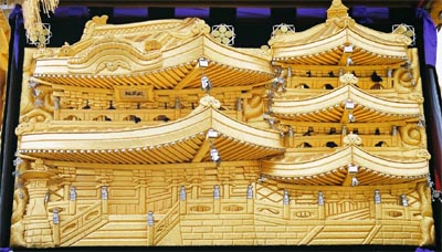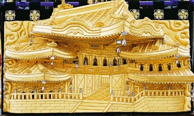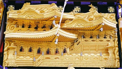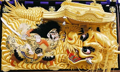 高欄幕 素戔嗚尊大蛇退治 (御殿の額は北野天満宮) |