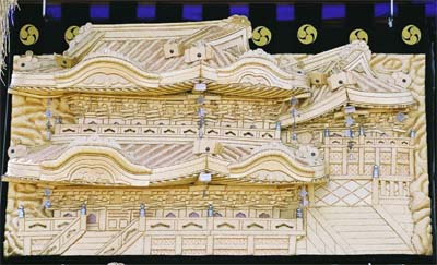 高欄幕 阿形の龍と獅子 (平成21年〜) ※撮影:平成25年 平成15年以降、全ての飾り幕を順次補修。 特に「阿形の龍」は著しい変化を遂げた。 |