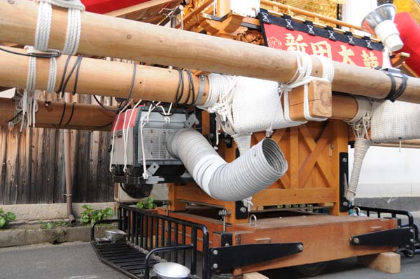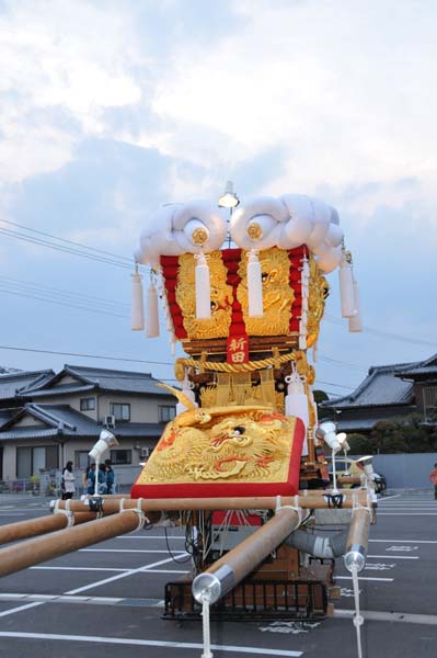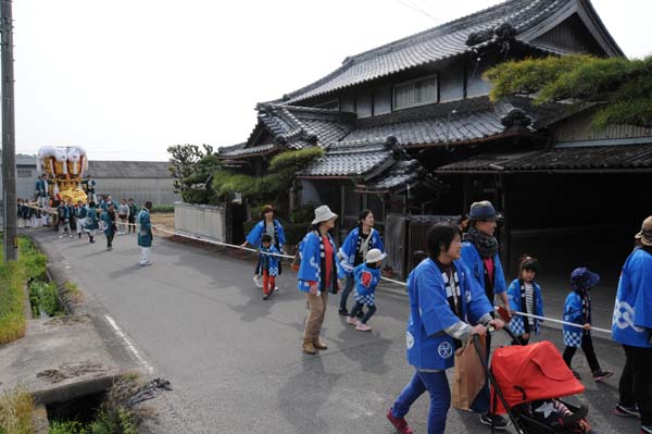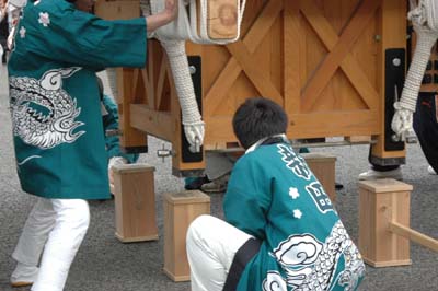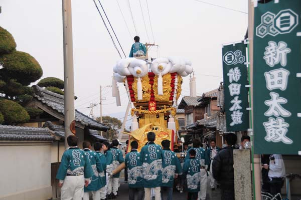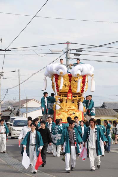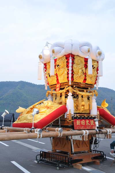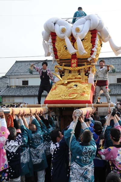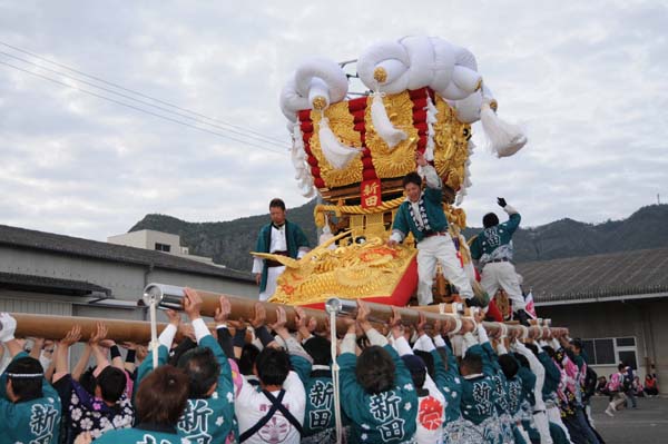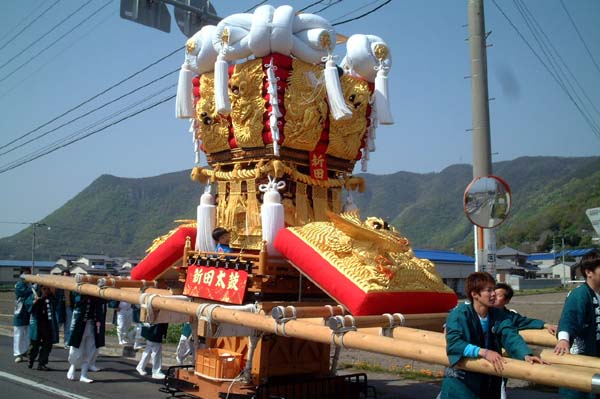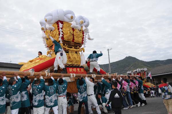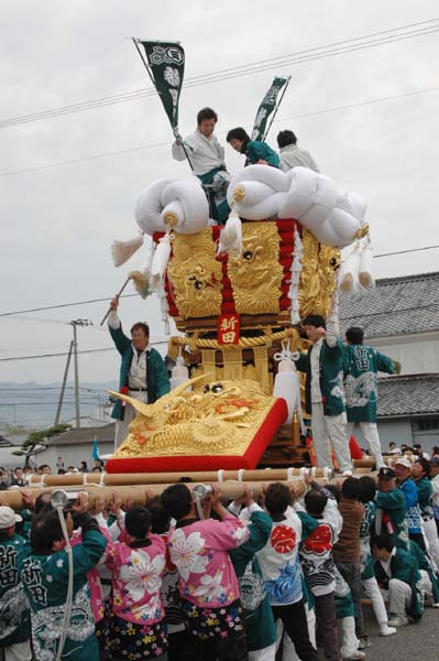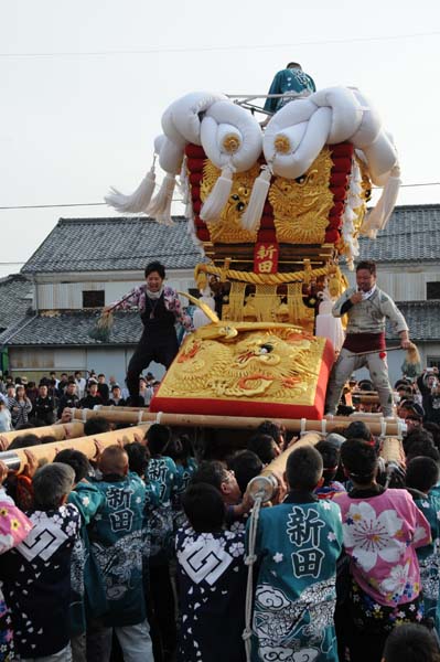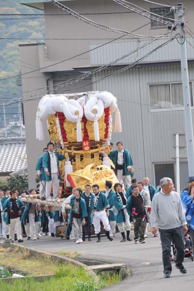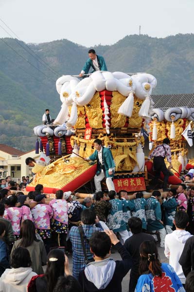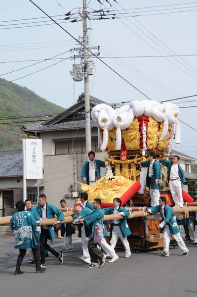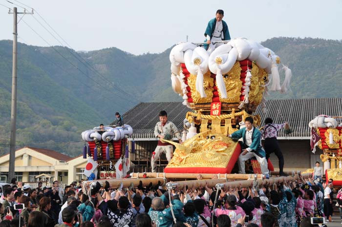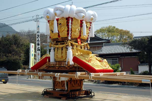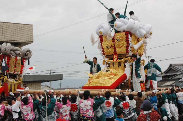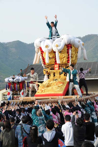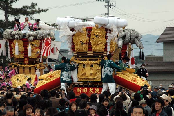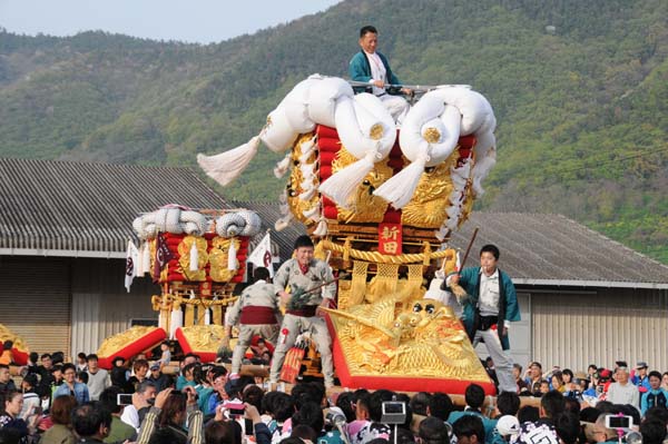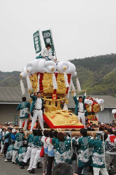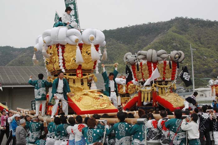 平成14年4月13日 高屋・室本地区内運行 左:室本新田太鼓台 右:西下太鼓台 |