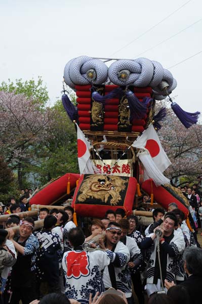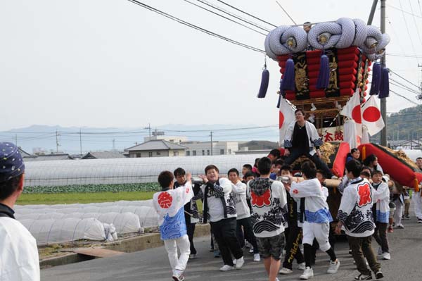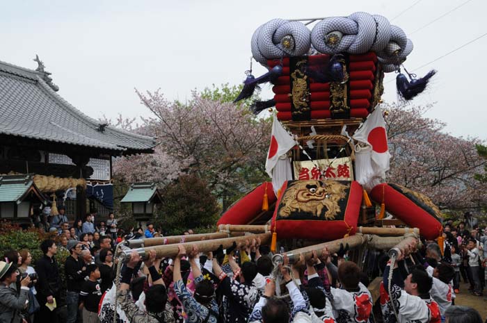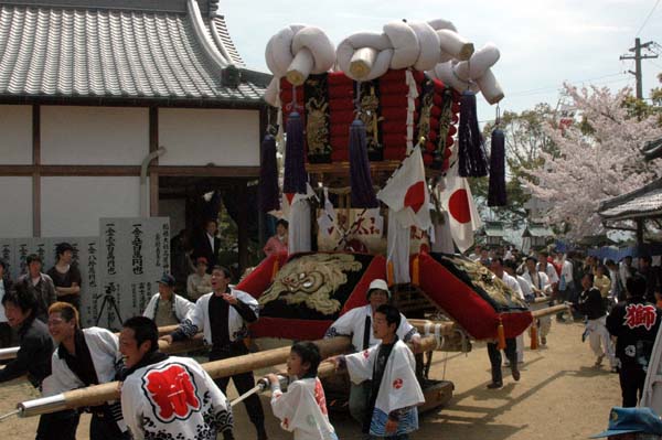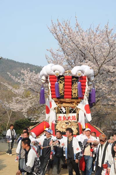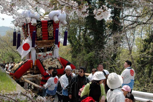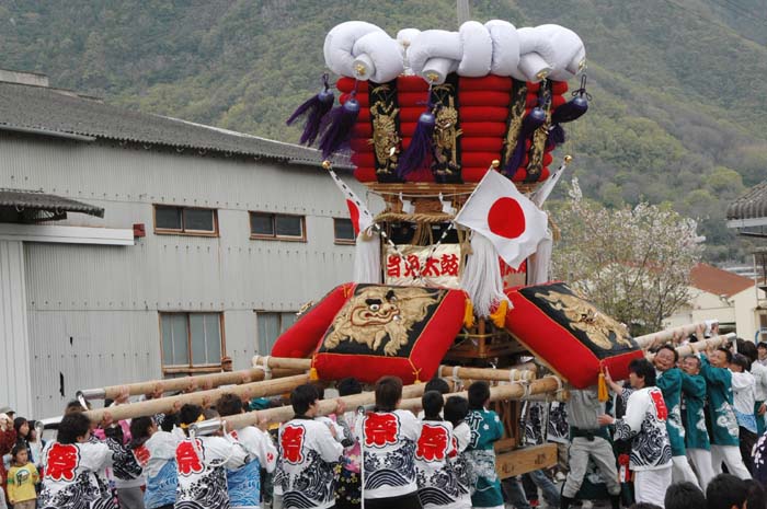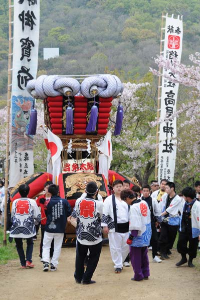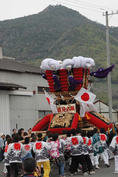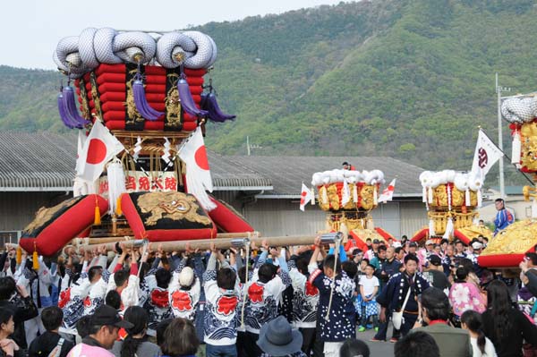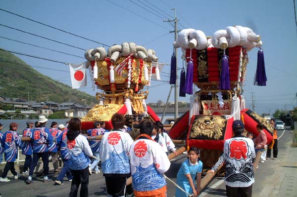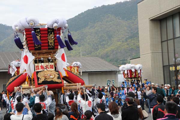 平成14年4月13日 高屋・室本地区内運行 左:西下太鼓台 右:当免太鼓台 |