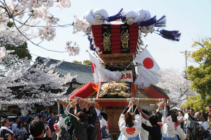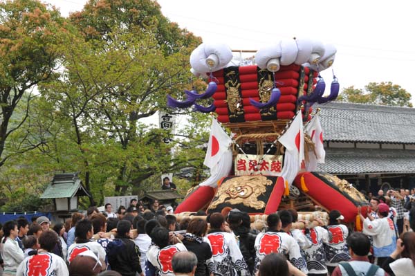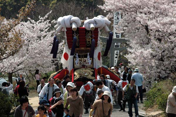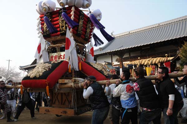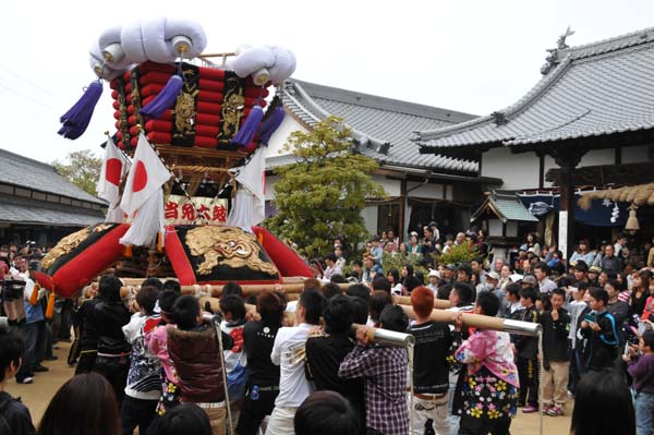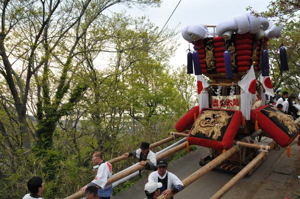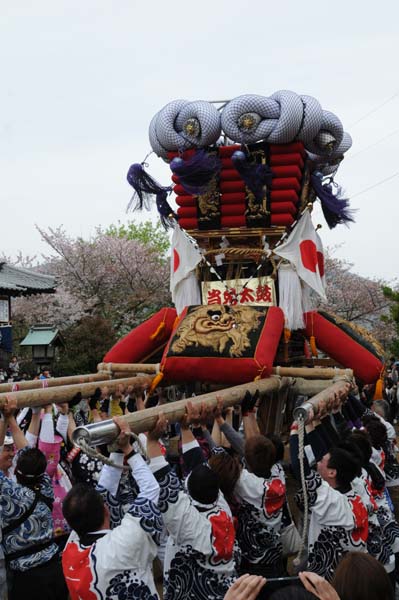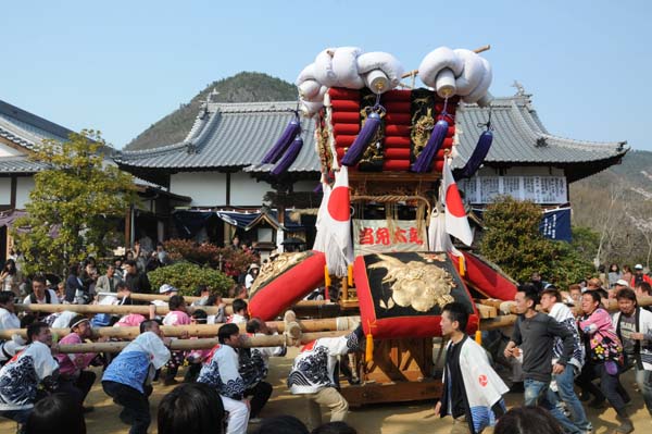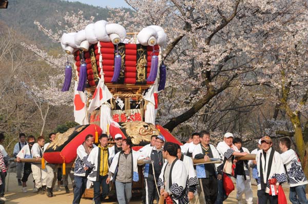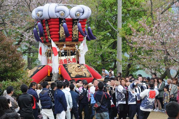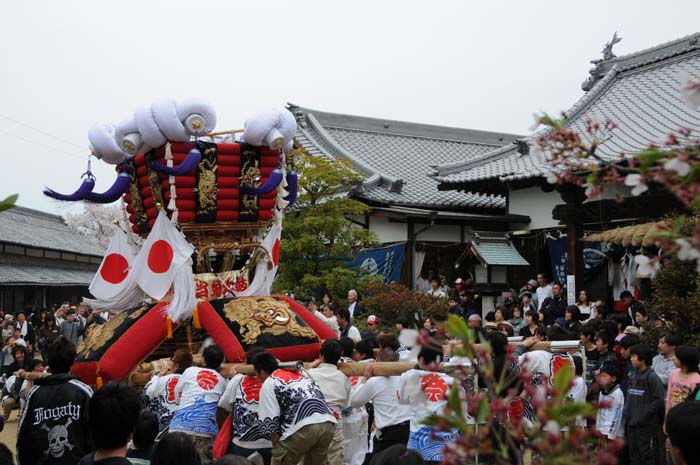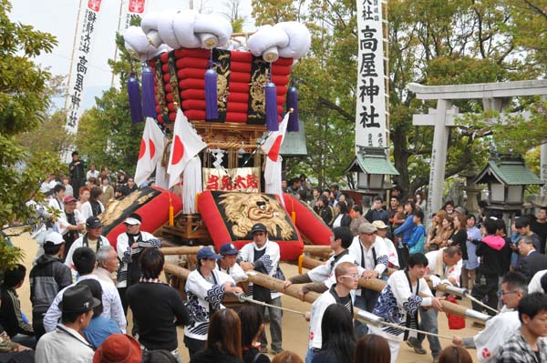 平成14年4月13日 高屋・室本地区内運行 左:西下太鼓台 右:当免太鼓台 |