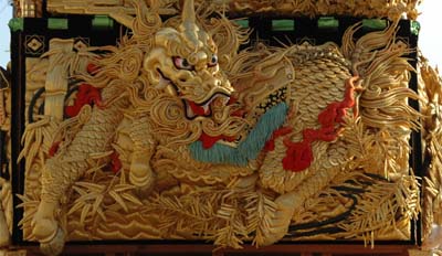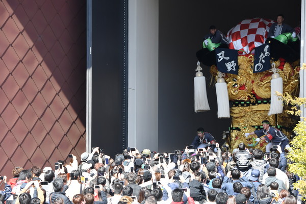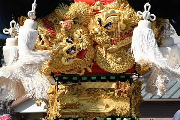 布団締めは先々代の太鼓台を踏襲した跳尾タイプ。4面の阿龍が持つ宝珠は黒・赤・白・緑の異なる色彩を放つ。 上幕の中国庭園<網師園>には多数の唐獅子が、高覧幕は禽獣や人物が描かれている。 |