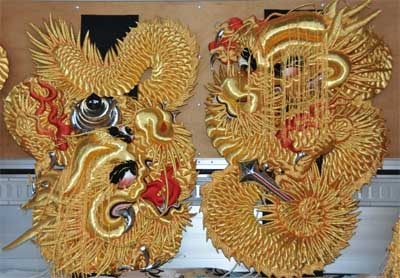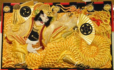 高欄幕(正面左) 龍頭 毛利軍3万騎の寄せ手の兵を、龍に見立てて御代島(みよしま)沖に上陸する様子を表しています。 |