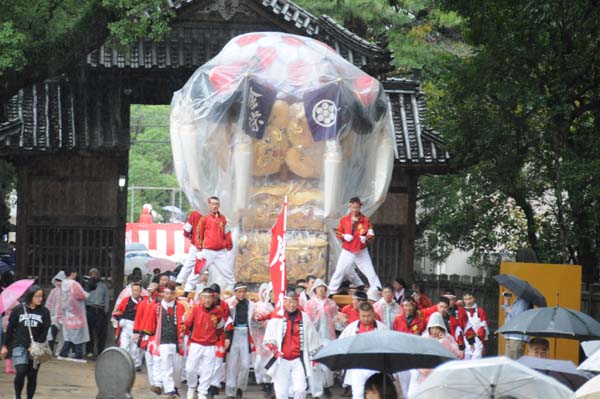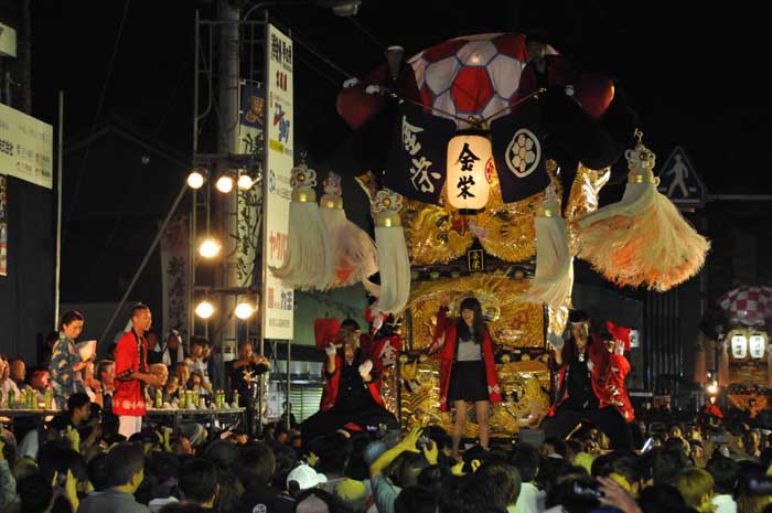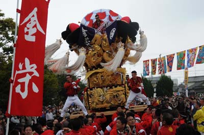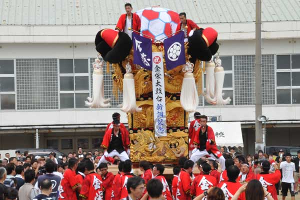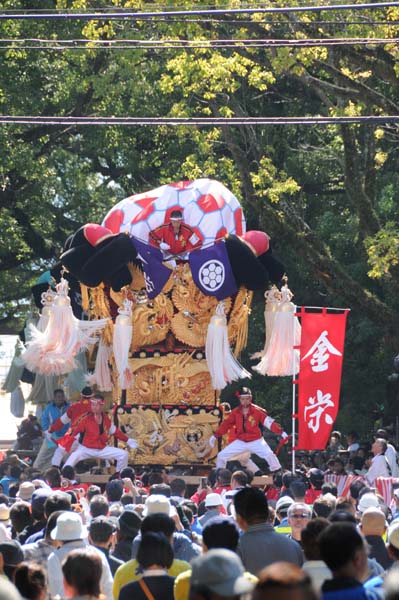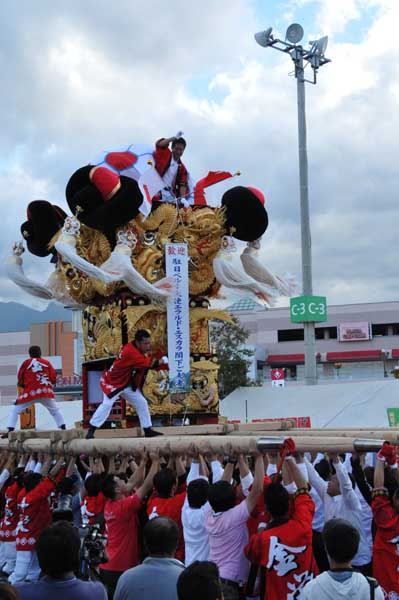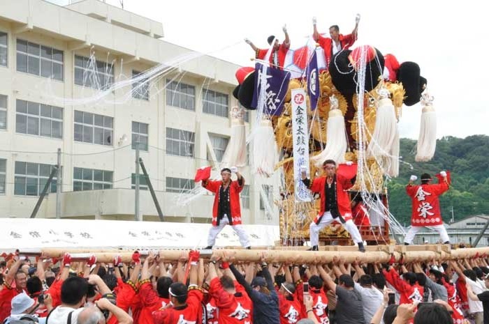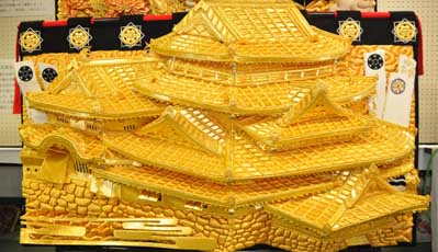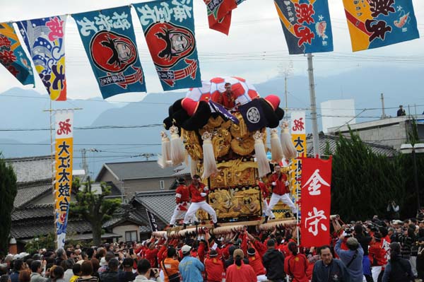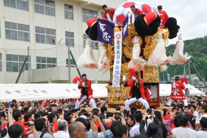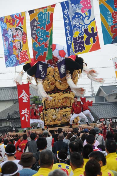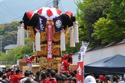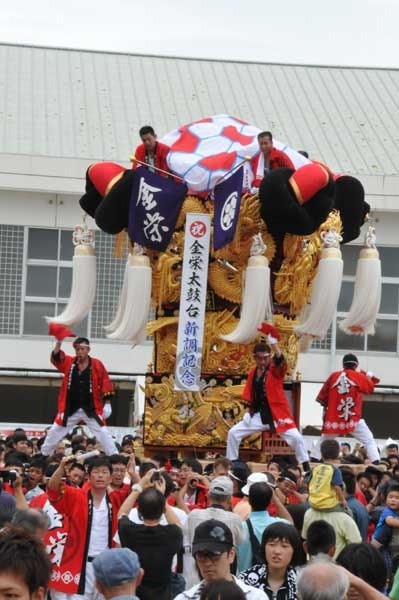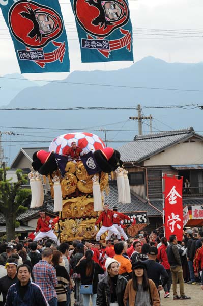 飾り幕制作 (株)金鱗 飾り幕は、全国統一を目指す羽柴秀吉(豊臣秀吉)の命を受けた中国・毛利氏の小早川隆景率いる軍勢が伊予国新居郡(現在の新居浜市)に上陸し、金栄地区の金子城城主率いる地元勢力を圧倒的な軍勢で制圧した史実「天正の陣」を題材にしている。 |