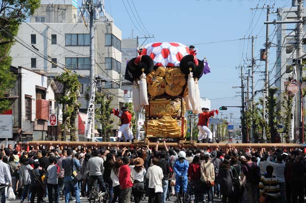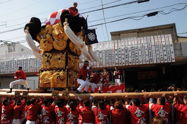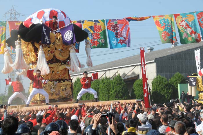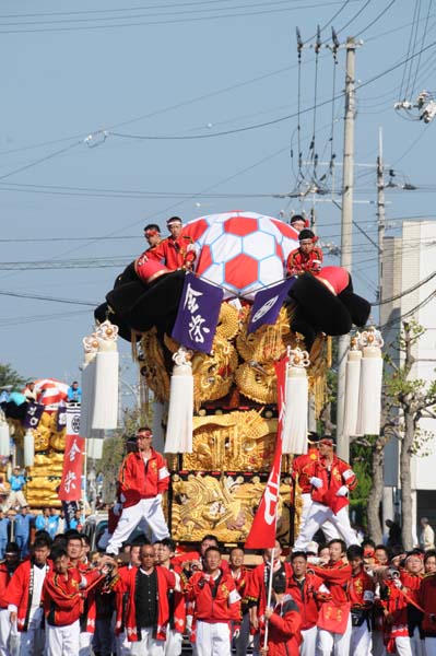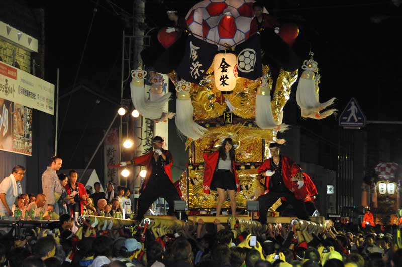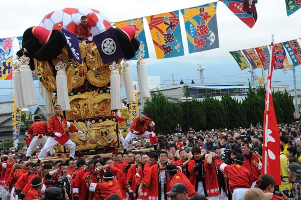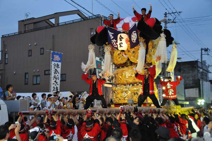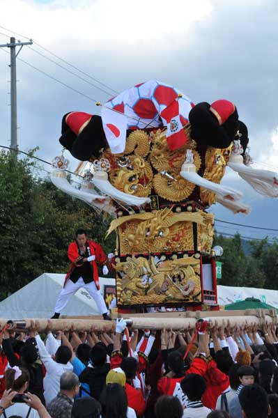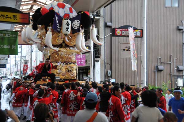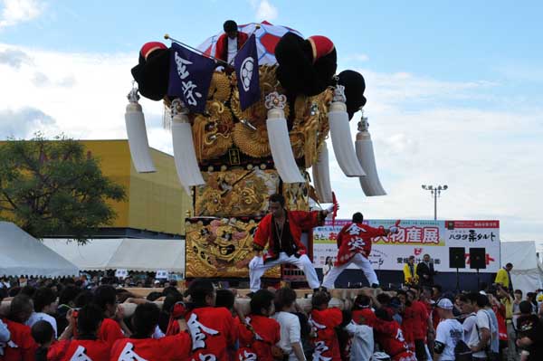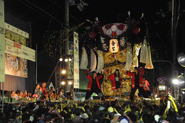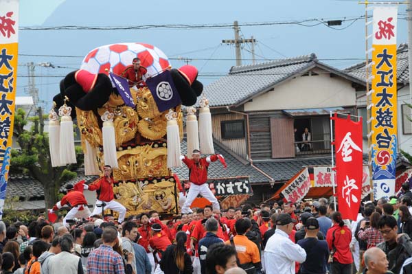 飾り幕制作 (株)金鱗 飾り幕は、全国統一を目指す羽柴秀吉(豊臣秀吉)の命を受けた中国・毛利氏の小早川隆景率いる軍勢が伊予国新居郡(現在の新居浜市)に上陸し、金栄地区の金子城城主率いる地元勢力を圧倒的な軍勢で制圧した史実「天正の陣」を題材にしている。 |