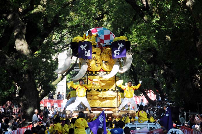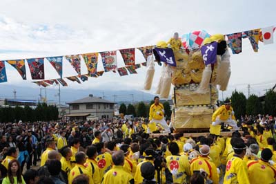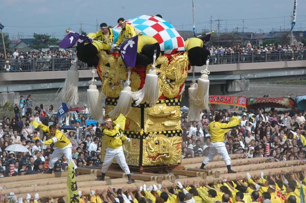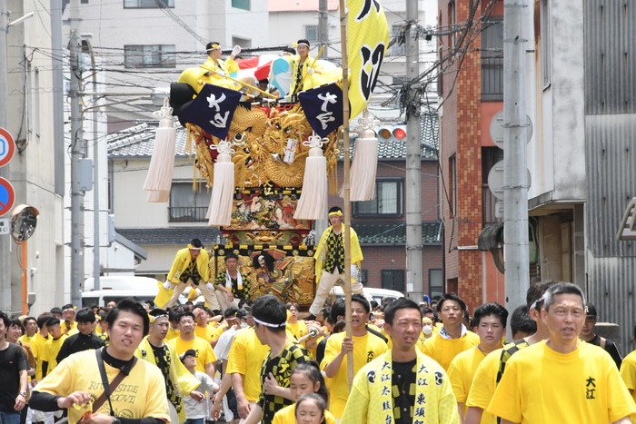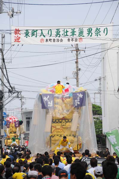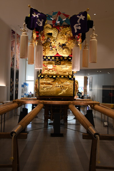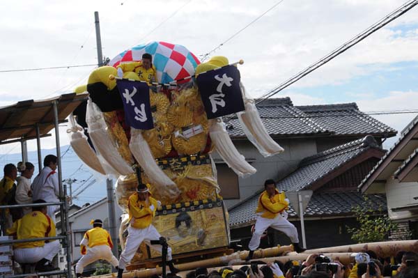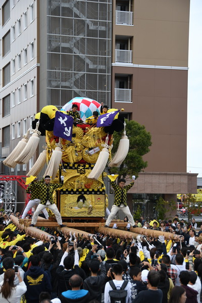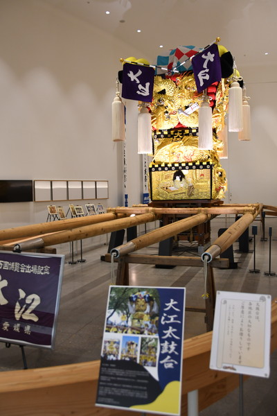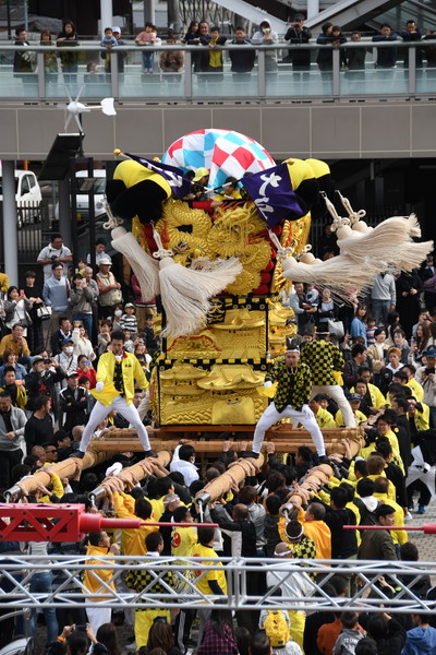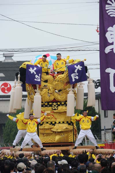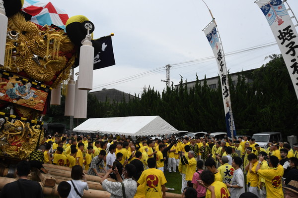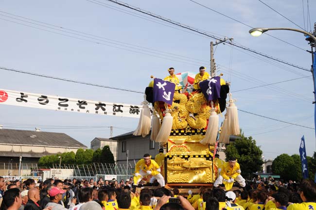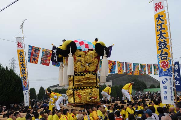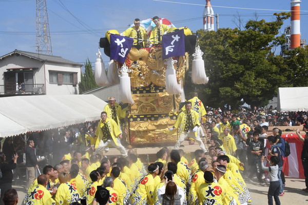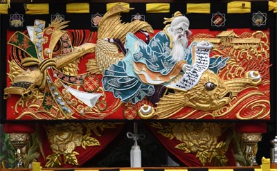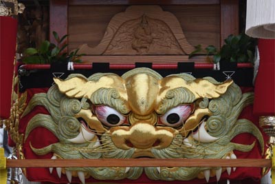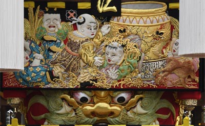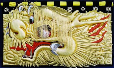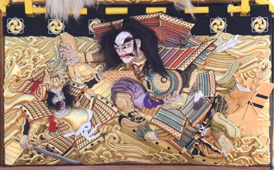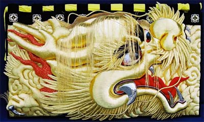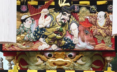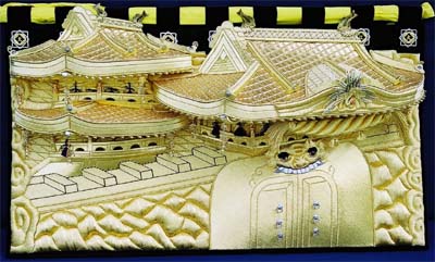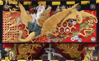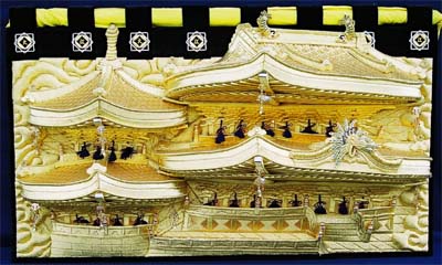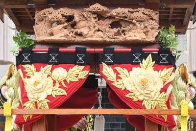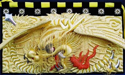 先代・大江太鼓台の飾り幕(高木縫師制作)を横山縫師を中心に金糸替え。 高欄幕の[カンケツ童子]のみ先々々代・大江太鼓台のカンケツ童子を参考に制作。 |