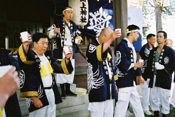 | 田の上太鼓台、東雲で昼食中に、東雲太鼓台登場