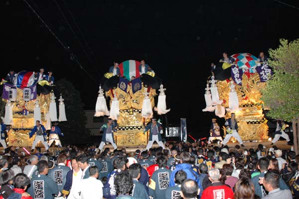 敷島通りを3台の太鼓台が並びました 運行予定にもない突然のプチ夜太鼓イベントに どこからともなくたくさんのギャラリーも集まってきました |