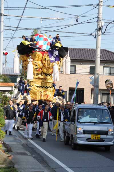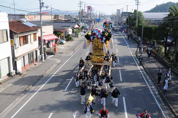 7時45分 太鼓台は神社を出発、田の上路へ。 |
