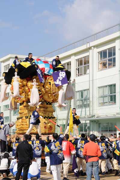 9時前 神郷小学校前へ到着した田の上太鼓台。 |