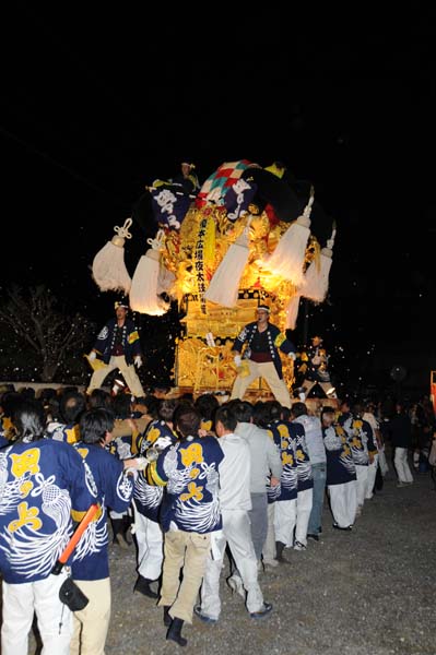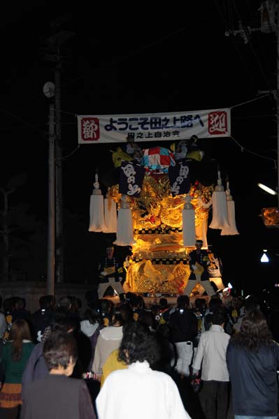 18時50分 マルヨシセンター夜太鼓が終わり退場する田の上太鼓台。 退場時に「祝・榎本広場夜太鼓開催」の垂れ幕を付け、 御神燈の提灯を先導に田の上路を運行します。 |