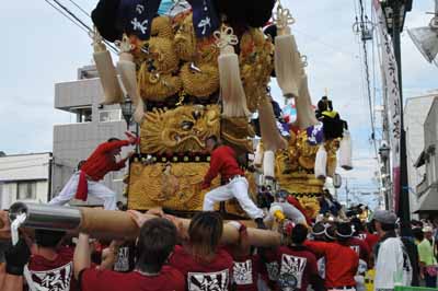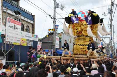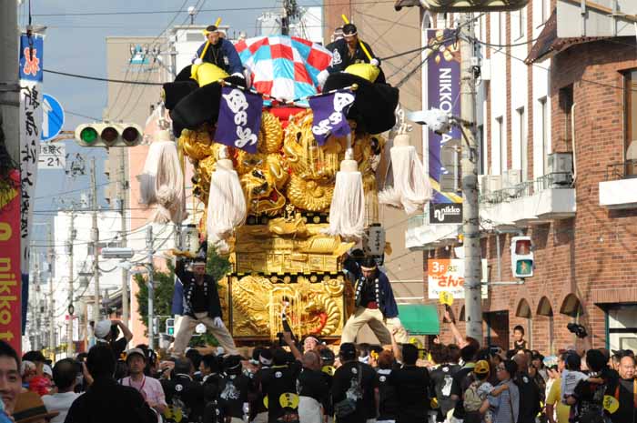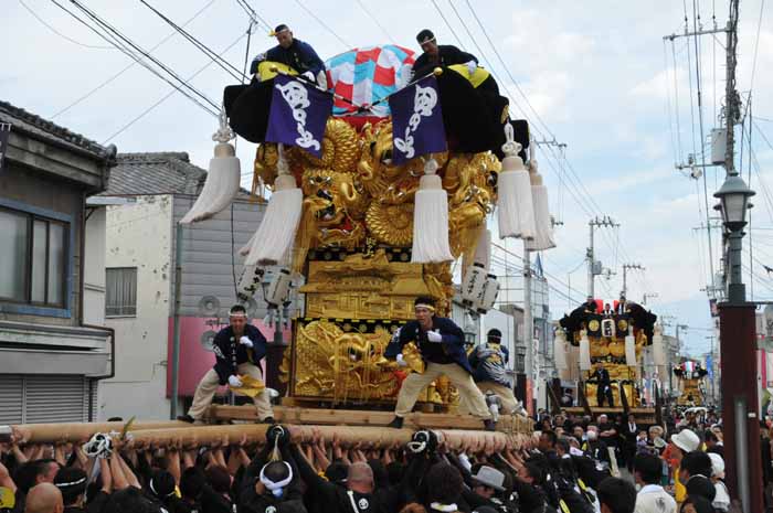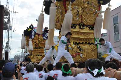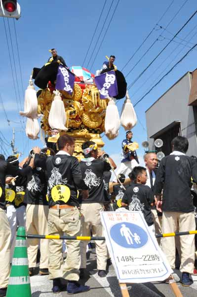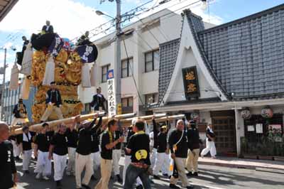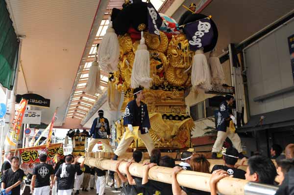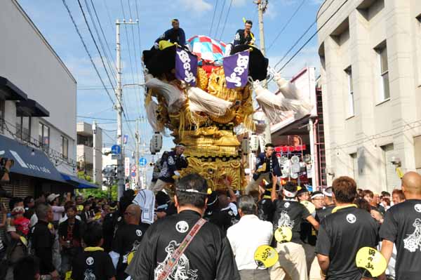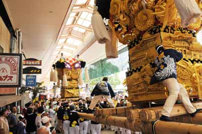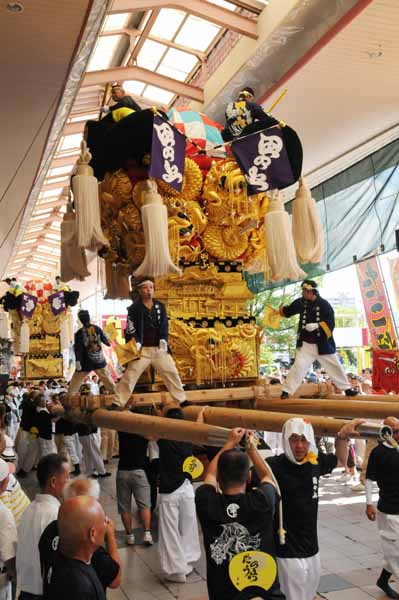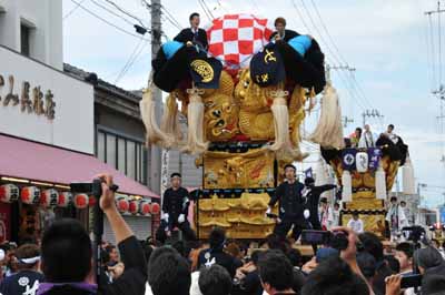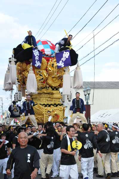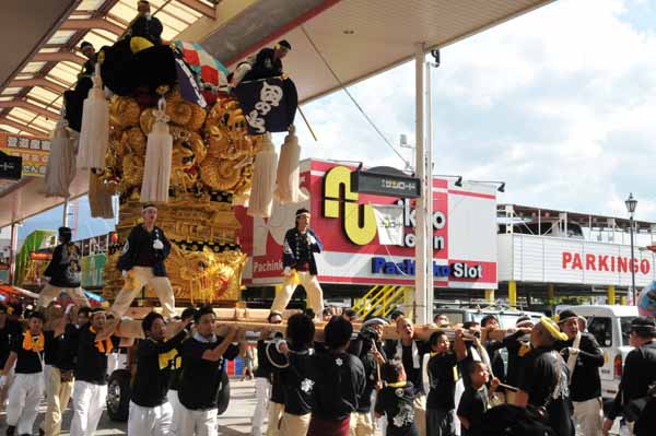 口屋公民館で組み立てしていた関太鼓台が運行開始、田之上太鼓台と端管合わせ |