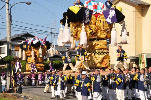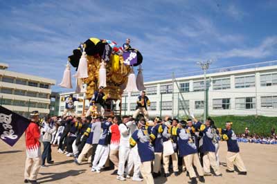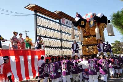 午前は国領川河川敷かきくらべに参加した川東地区太鼓台 田之上太鼓台は田之上自治会館で、阿島太鼓台・白浜太鼓台・新田太鼓台は田上神社で昼食をとり 午後から榎本広場に集まり統一行動開始 |