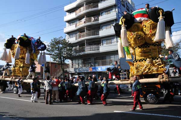 高田1丁目交差点の北から宇高太鼓台、西から田之上太鼓台が!? |