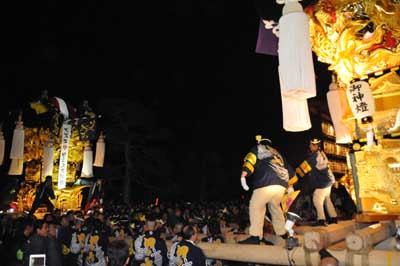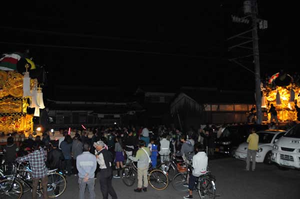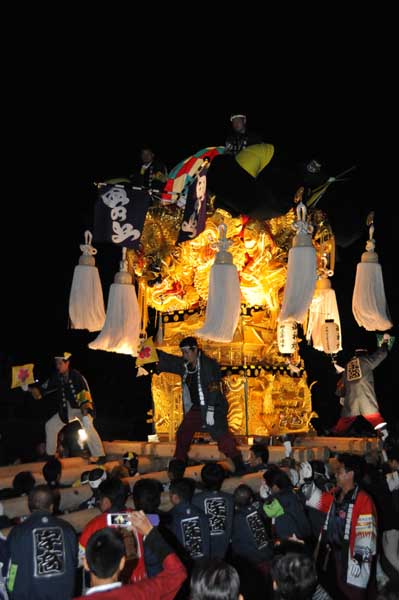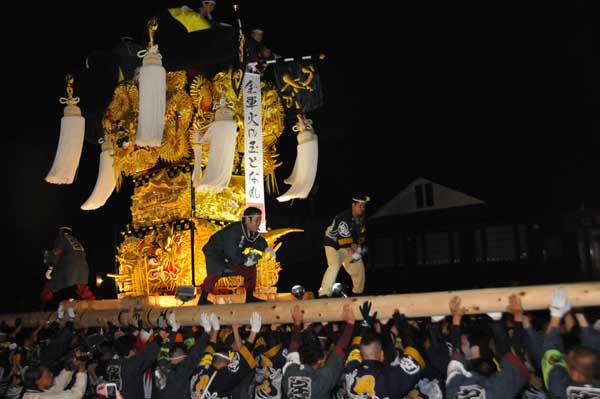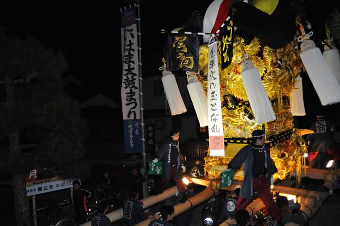 大人太鼓台はすぐに夜太鼓準備を終え、天神浜かきくらべに出発 |