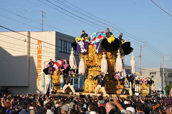 川東地区太鼓台4台は榎之本広場から多喜浜駅前へ移動 16時より多喜浜駅前かきくらべ開始、田之上は4番手で入場です |