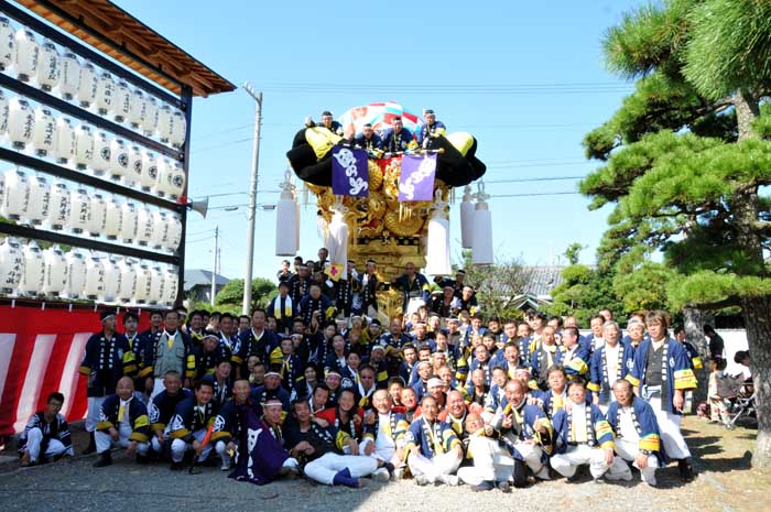 午前は川東地区太鼓台で阿島地区まで統一運行 午後の運行開始前に記念撮影 |