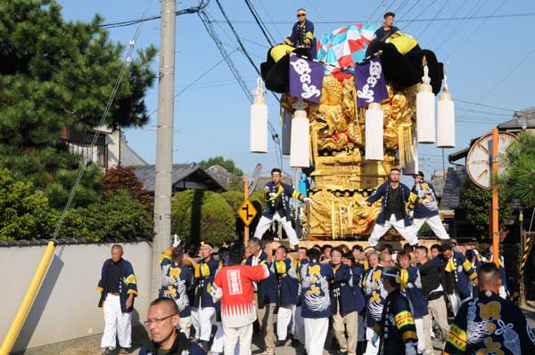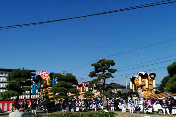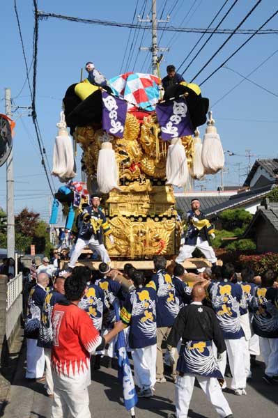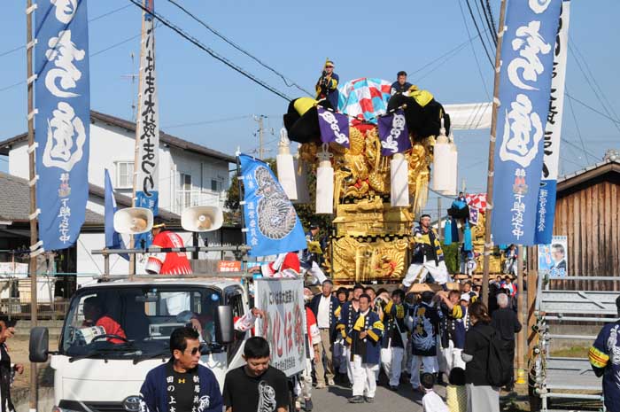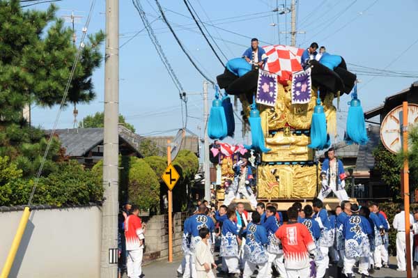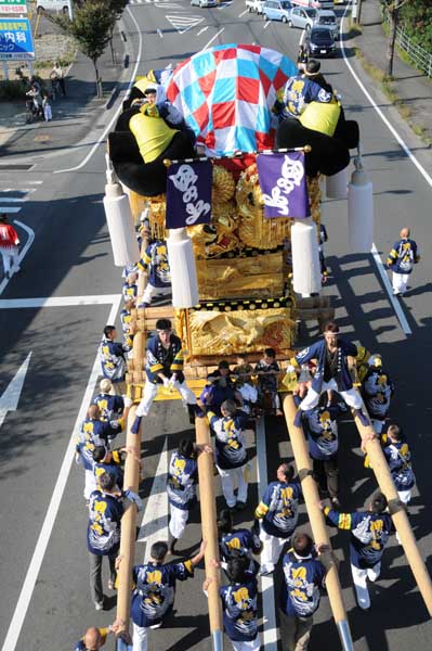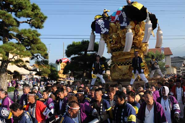 最終日午後2時半、江の口交差点で川東地区太鼓台と合流 今年は八旛神社宮入に不参加のため、田之上地区周辺での統一運行開始 |