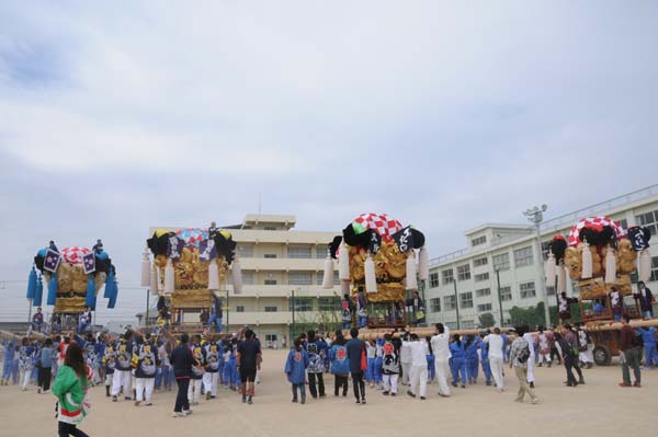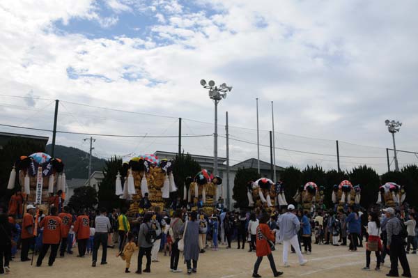 9時から神郷小学校お祭り集会、神郷小学校区太鼓台が集合 (一昨年の鉢合わせにより松神子太鼓台が不出場) |