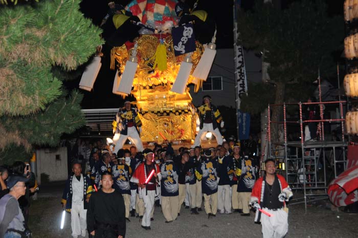 各太鼓台入場終え、八旛神社宮入もフィナーレ 19時40分、八旛神社より退場開始する田之上太鼓台 かき夫も減ってますがここでも引きずらず最後までよく担ぎ出した