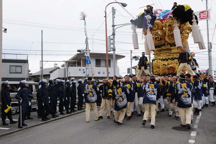 川東地区太鼓台と大名行列のように江の口交差点まで運行 江の口交差点で各太鼓台と最後のお別れ